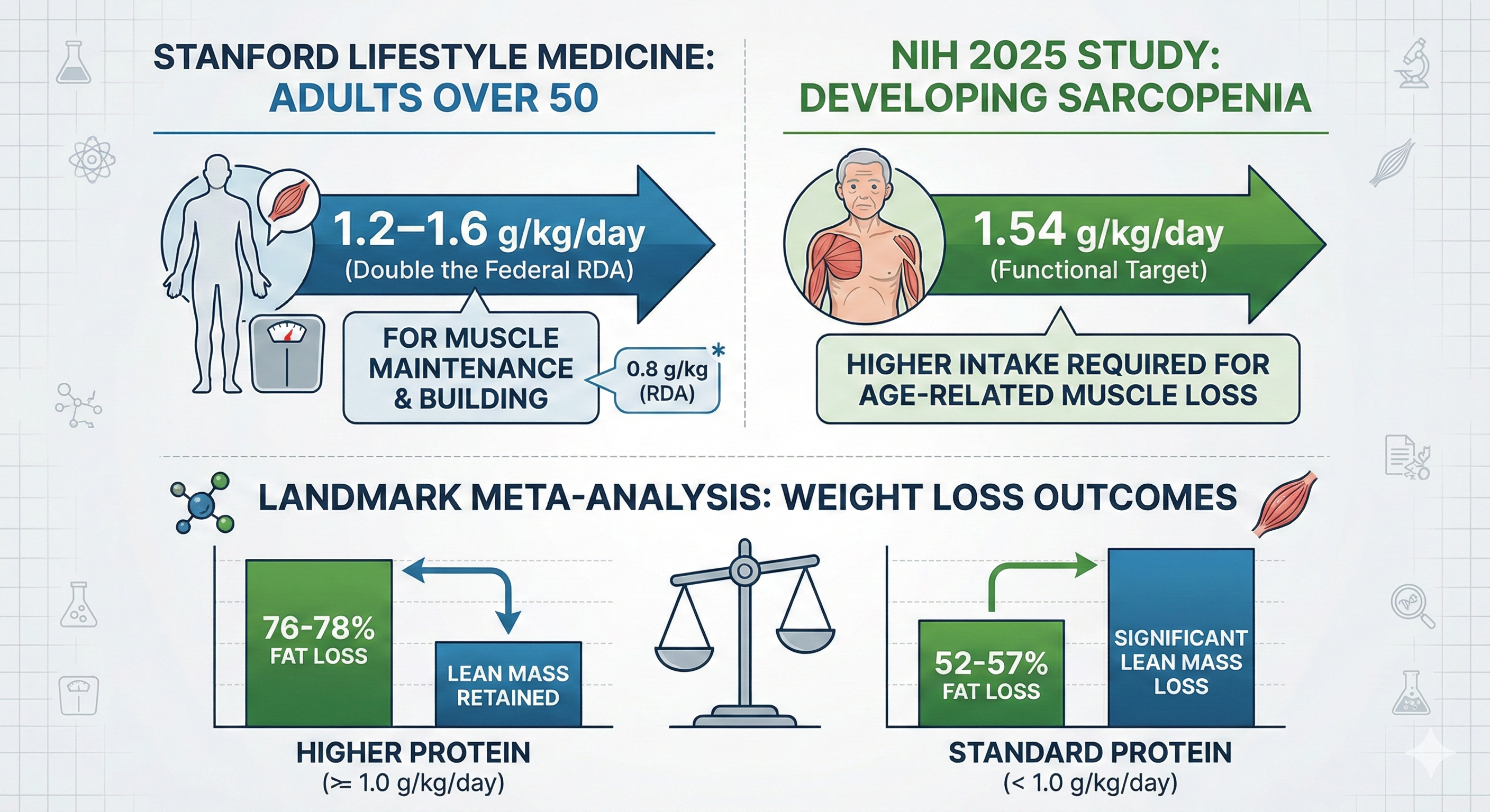 The science has converged on a clear evidence-based range for adults over 50. Stanford Lifestyle Medicine recommends 1.2–1.6 grams of protein per kilogram of body weight per day — roughly double the federal RDA — for adults over 50 who want to maintain or build muscle.